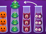 In the game "Ball Sort Halloween," you need to distribute multicolored balls with monsters into separate test tubes. This is a Halloween-themed logic puzzle where each tube must contain balls of only one color. At the beginning of the level, the balls are mixed up—orange, purple, and green balls are all in one test tube. Your task is to rearrange them so that each tube contains only balls of the same color. The number of test tubes is limited, so you need to think through your moves in advance.